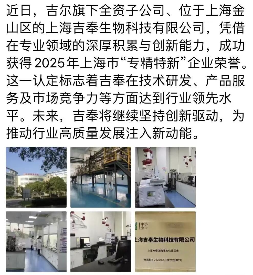 吉奉生物获 “专精特新” 认定 行业竞争力领先