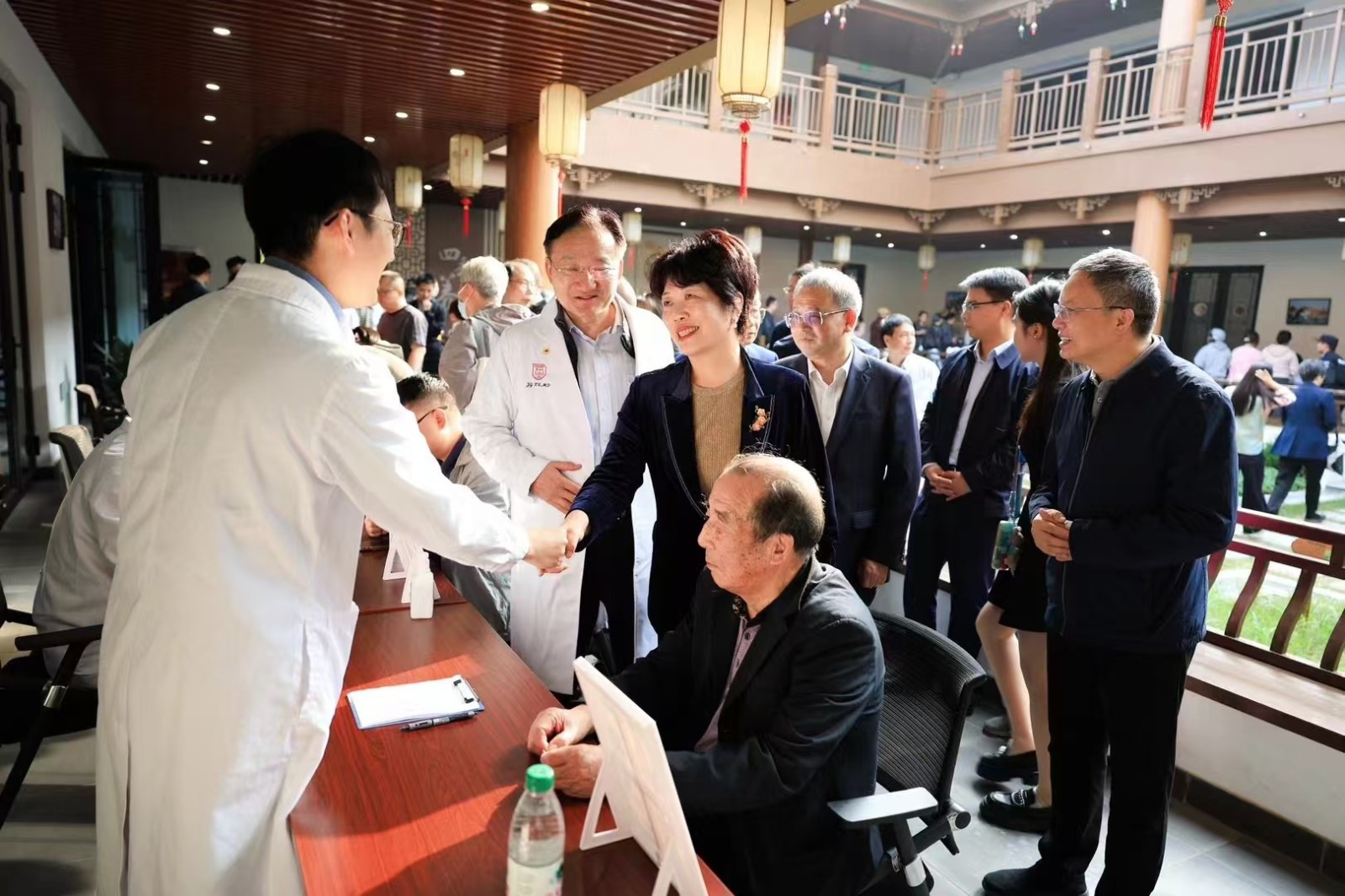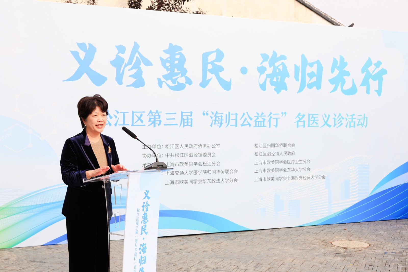 第三届“义诊惠民·海归先行”名医义诊活动11月2日在上海市松江区泗泾镇举行。本次活动邀请了来自沪上多家三甲医院的32位海归医疗专家,现场共接待居民近500人次。 吉尔总经理周敏,代表上海市欧美同学会致辞。